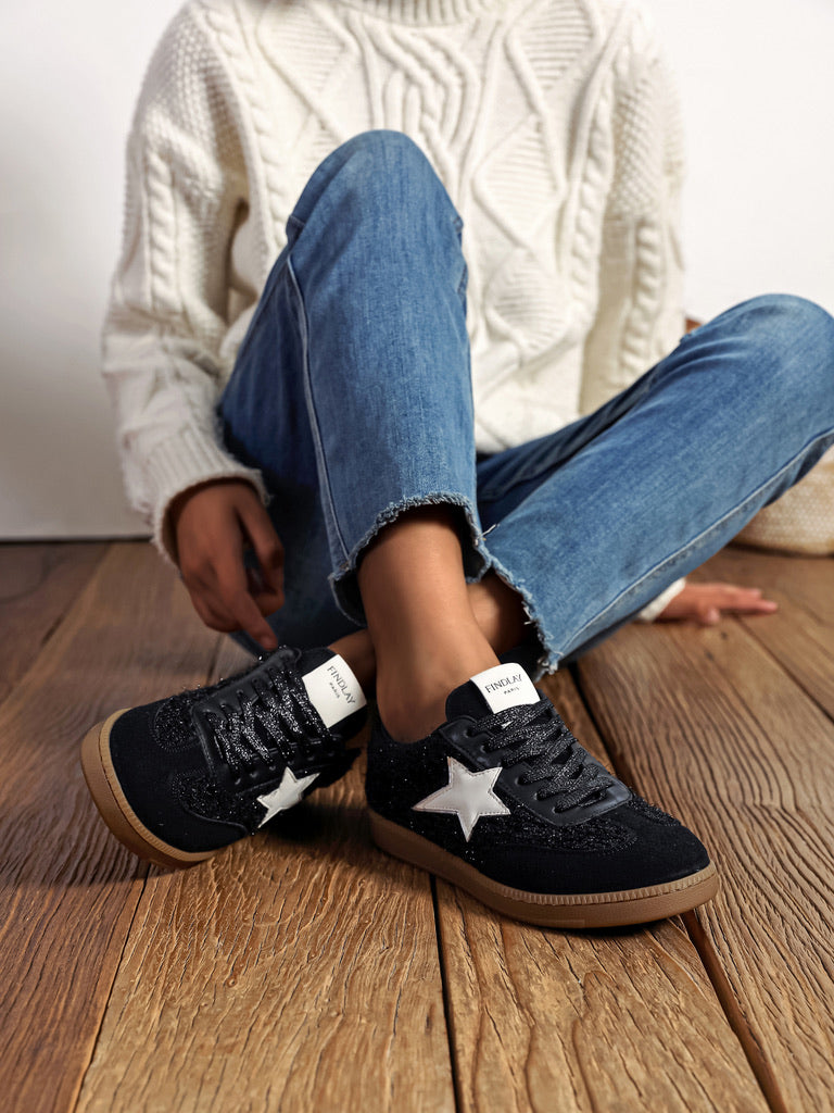 Baskets basses noires associant suédé et textile texturé effet bouclé, rehaussées d’une étoile blanche contrastante sur le côté. Les lacets noirs et la semelle en gomme couleur caramel apportent équilibre et modernité. Un modèle au design affirmé qui conjugue confort, originalité et allure citadine.