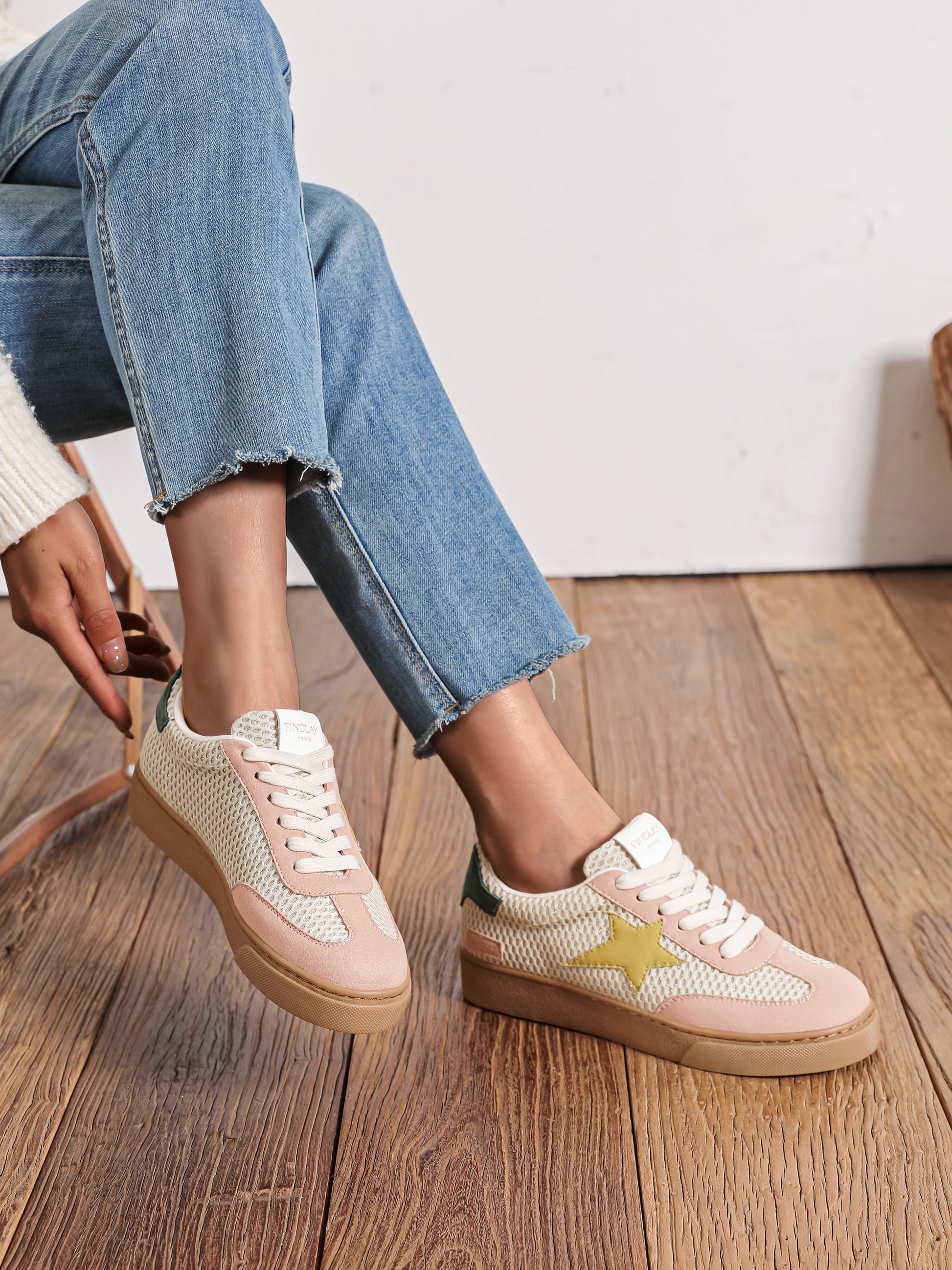 🧵 Matières respirantes : tige en maille filet crème pour une aération optimale, renforcée par des empiècements en suédine.