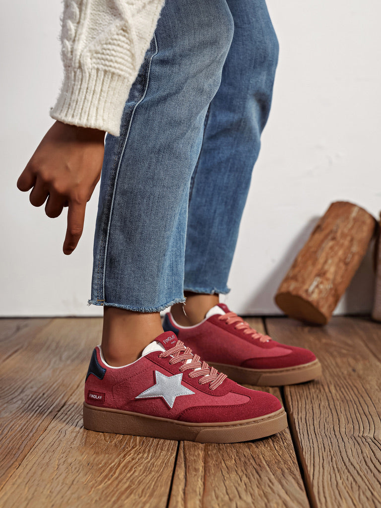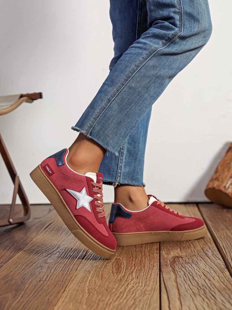 Baskets basses en suédine rouge, ornées d’une étoile argentée contrastante sur le côté. Les lacets bicolores apportent une note graphique, tandis que la semelle en gomme camel souligne une allure rétro-chic. Un empiècement noir à l’arrière vient compléter la silhouette avec élégance. Un modèle vibrant qui conjugue confort et style citadin.