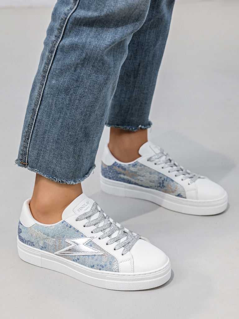 Misez sur ces baskets en simili blanc et bleu jean avec sur les côtés une découpe en forme d'éclair.