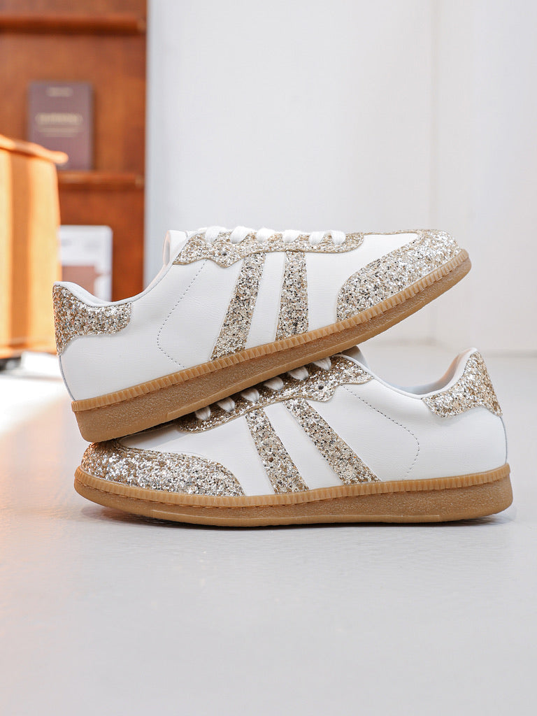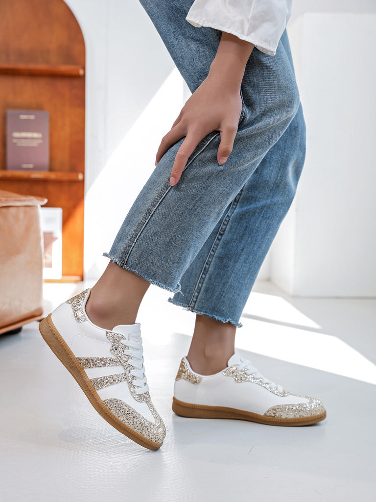 Cette sneaker affiche un design élégant et tendance, combinant un style rétro et des détails scintillants pour une allure moderne et sophistiquée.