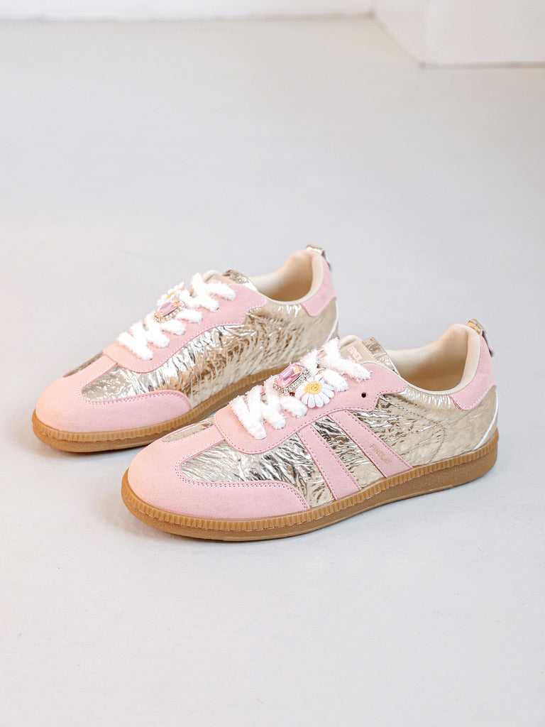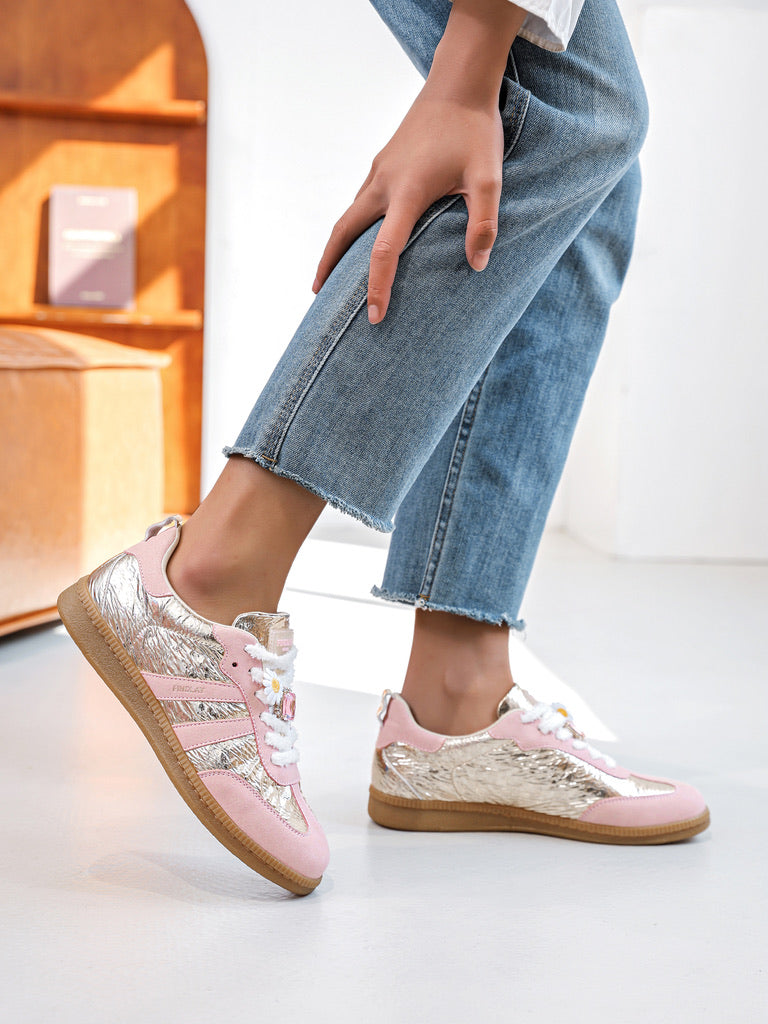 Cette paire de sneakers est un véritable mélange de douceur et d’audace, alliant des teintes féminines et des textures modernes pour un look unique.