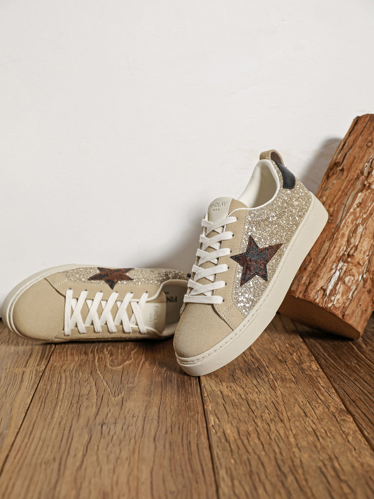 Baskets basses en cuir suédé beige ornées de panneaux pailletés dorés et d’une étoile contrastante marron sur le côté.