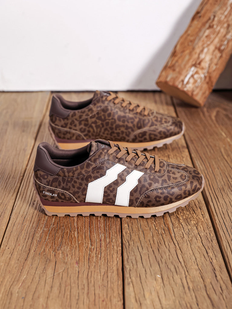 Baskets basses au motif léopard marron, rehaussées de bandes latérales blanches contrastantes. Leur semelle crantée couleur gomme assure confort et stabilité, tandis que les finitions soignées apportent une touche sportive et élégante. Un modèle audacieux qui associe esprit urbain et allure contemporaine.