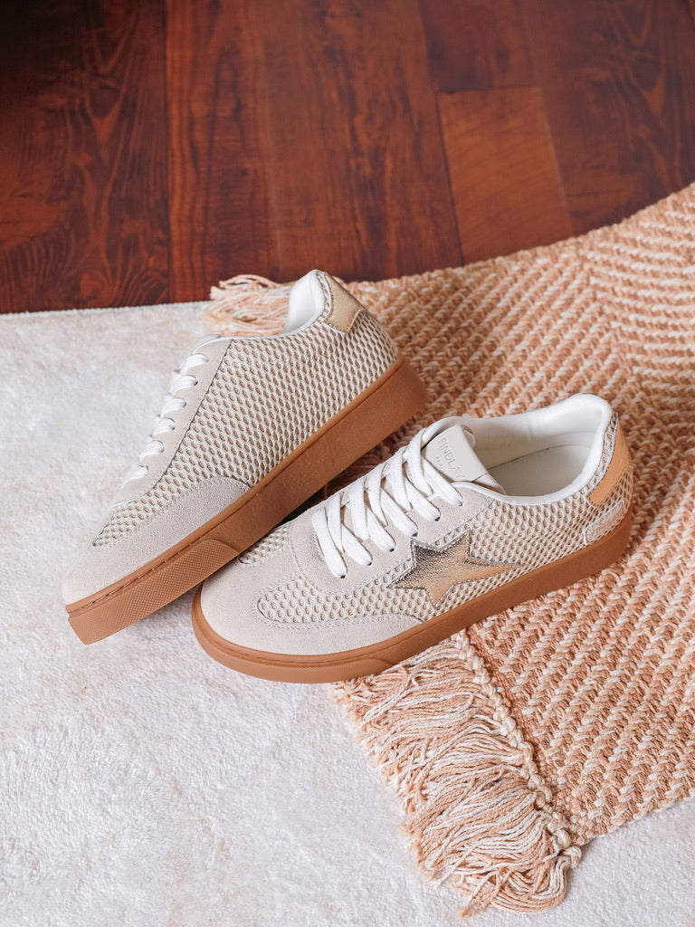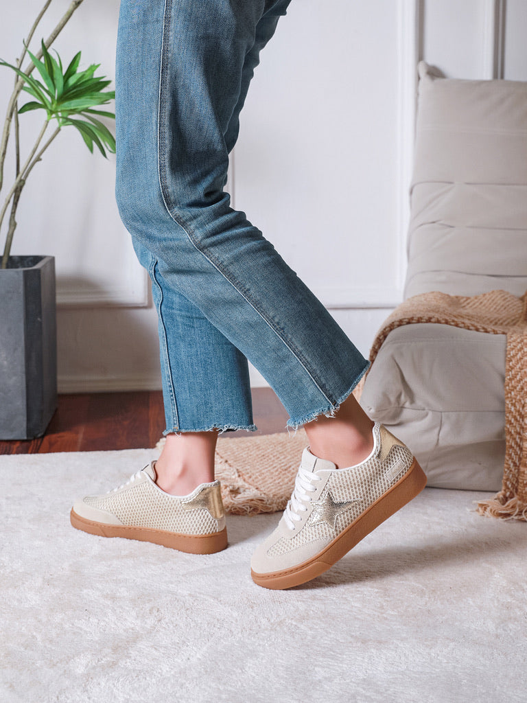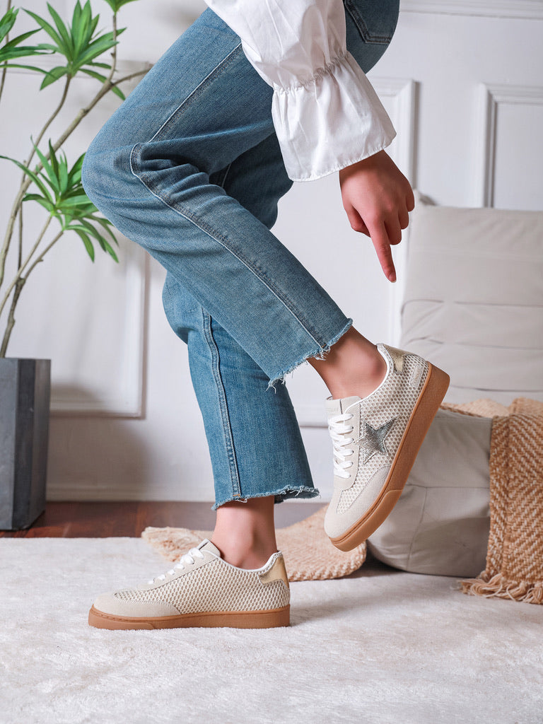 Baskets basses beige au design léger et respirant, parfaites pour la saison. La tige en maille ajourée apporte fraîcheur et confort, sublimée par une étoile latérale discrète et un empiècement doré au talon. Les lacets ton sur ton et la semelle gomme naturelle complètent le look casual chic. Un modèle facile à associer, idéal avec un jean pour un style décontracté et élégant.