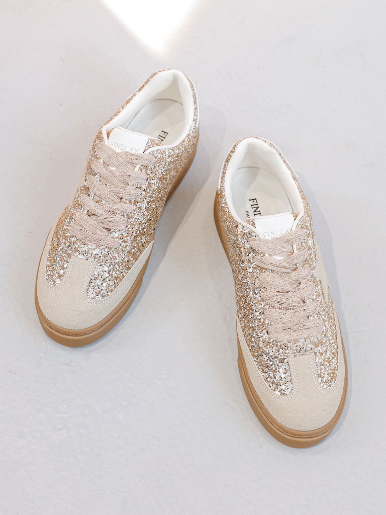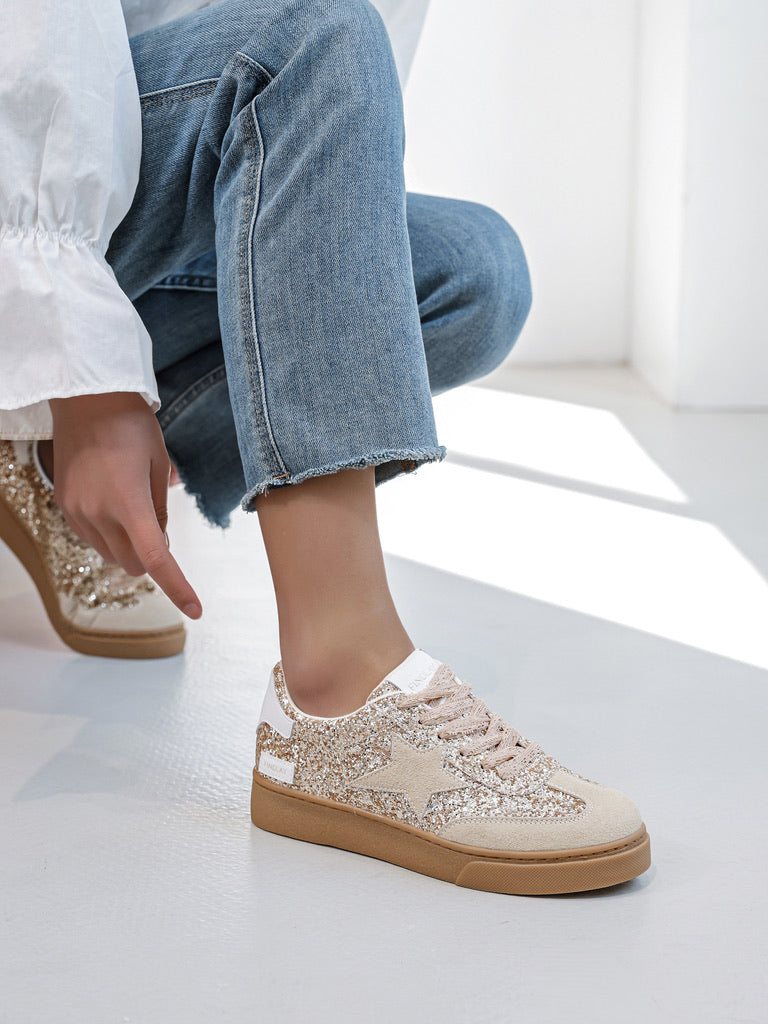 - Design : Une silhouette classique revisitée avec une finition pailletée dorée, idéale pour un look à la fois casual et sophistiqué.
