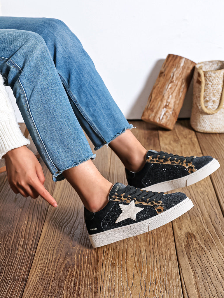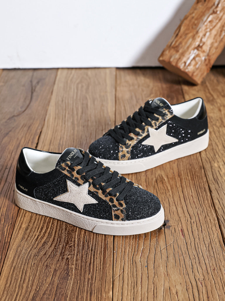 Elles sont en tissu noir pailleté, avec des détails en imprimé léopard sur les côtés et une grande étoile beige en suédine.