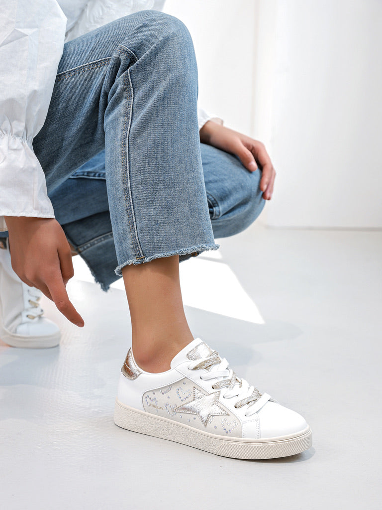 Cette sneaker blanche élégante et tendance présente des détails sophistiqués qui lui donnent une allure à la fois moderne et féminine.
