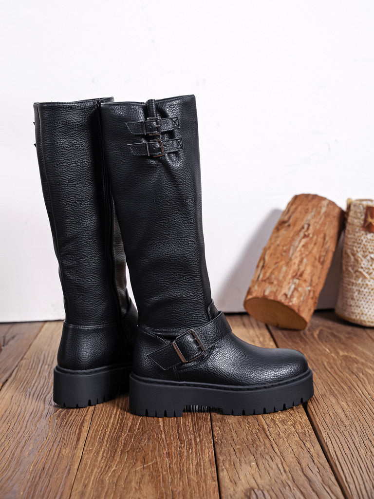 Bottes hautes en simili cuir noir à la texture grainée, dotées d’une semelle épaisse crantée au style affirmé.