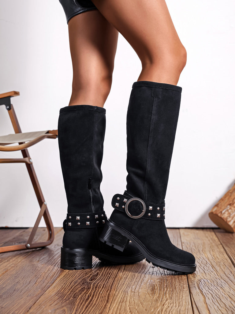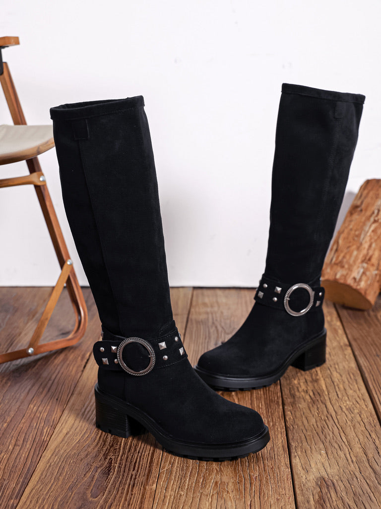 Bottes hautes en suedine noir, élégamment structurées avec un talon épais stable.
