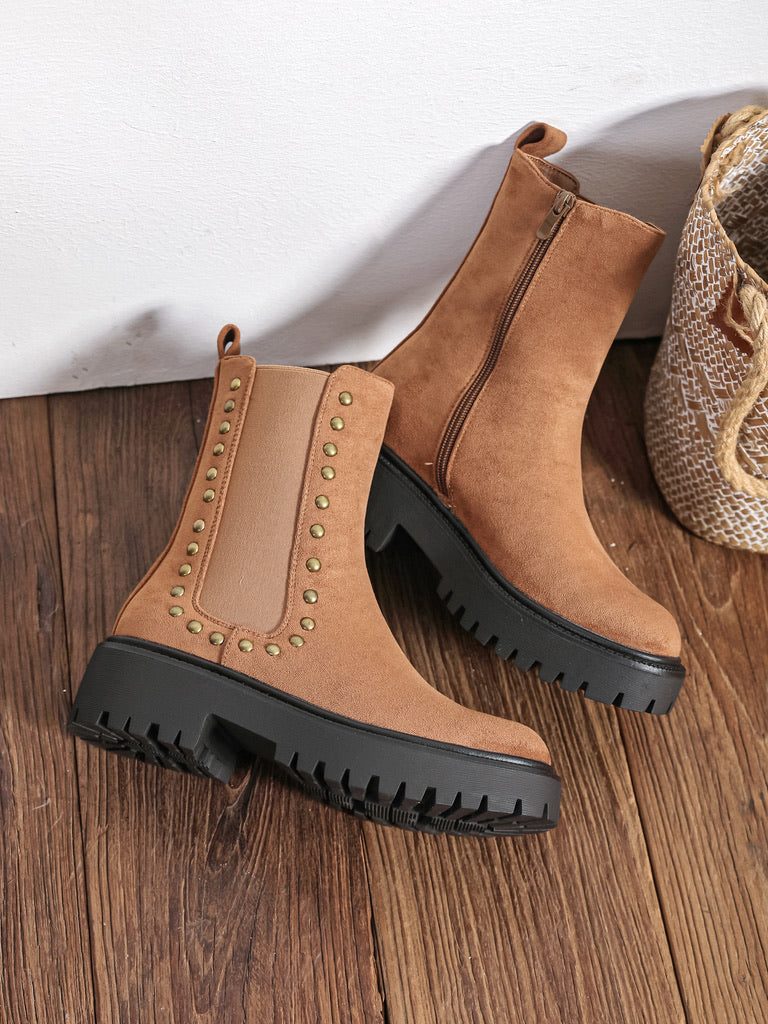 Adoptez un style affirmé avec ces bottines plates à semelle crantée et détails cloutés. À la fois confortables et tendances, elles se portent facilement au quotidien avec un jean, une robe ou un legging.