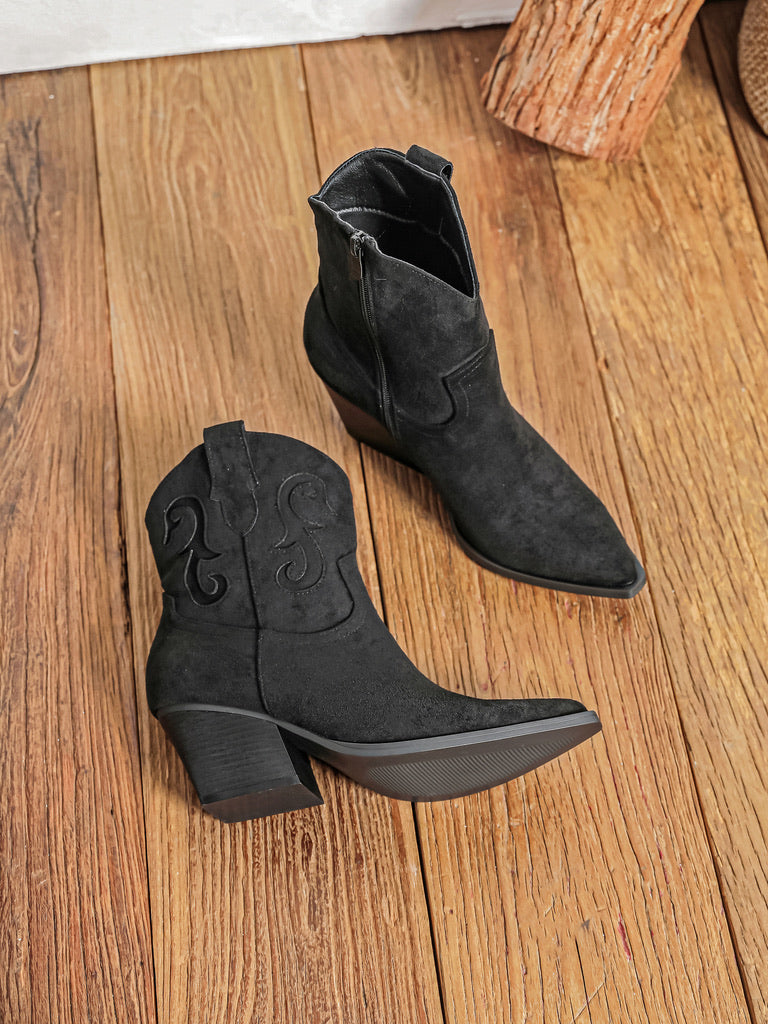 Apportez une touche cowboy à vos looks avec ces bottines western en suédine. Leur bout pointu et leur talon biseauté assurent une silhouette féminine et affirmée, parfaite avec une robe fluide ou un jean slim.