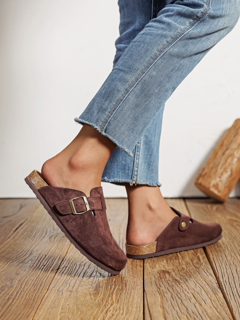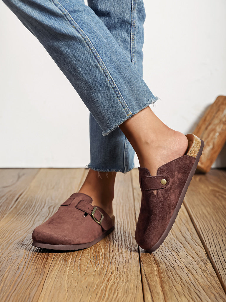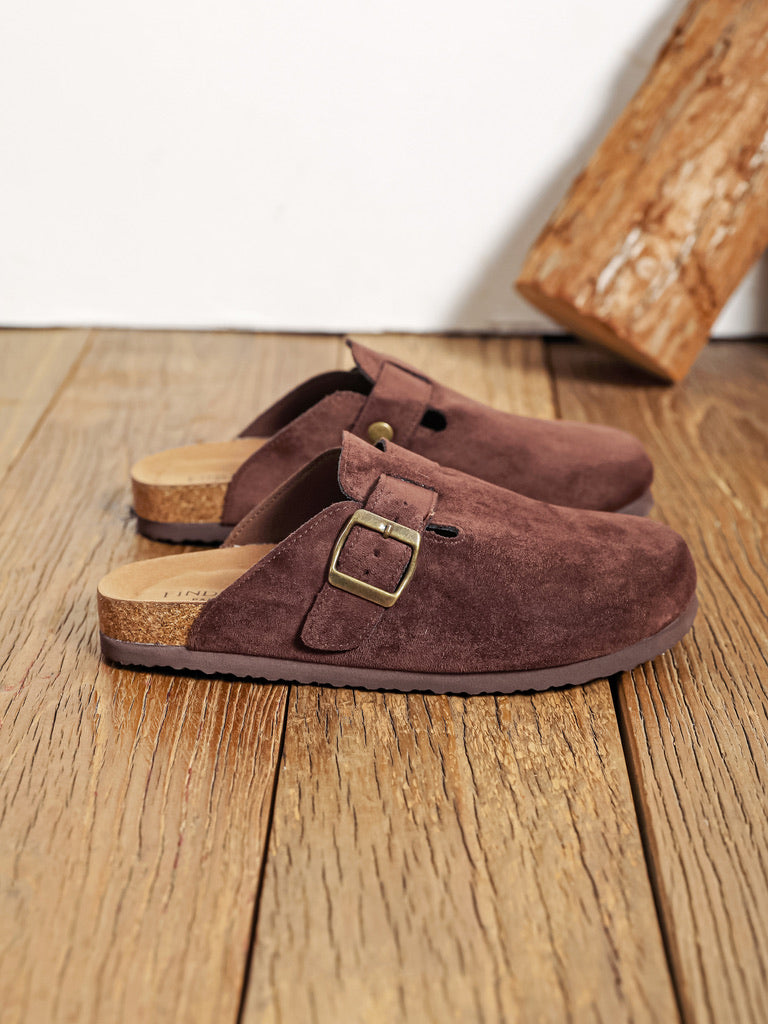 Sabot en suédine marron à l’allure minimaliste et intemporelle.