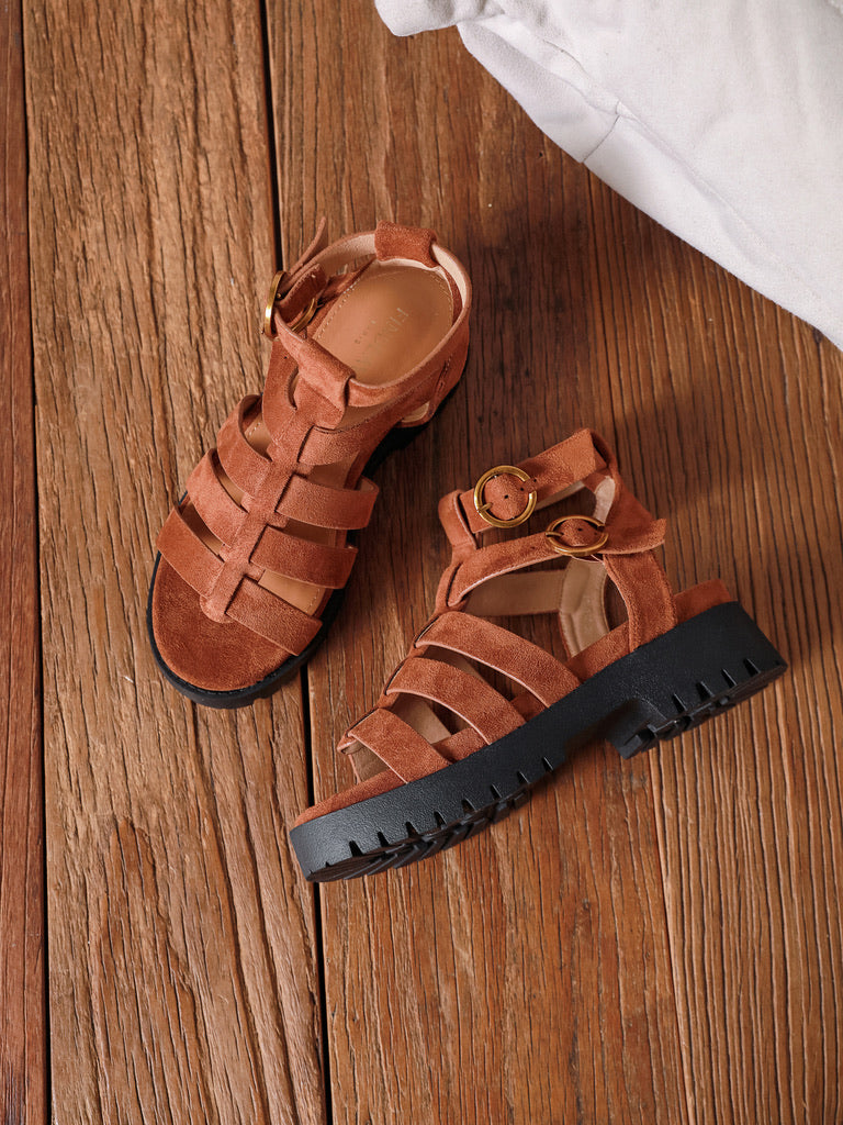 Sandales gladiateur camel suédine, au style audacieux et tendance. Multiples brides sur le dessus du pied avec détail central ajouré, bride cheville ajustable avec grande boucle dorée ronde. Semelle plateforme noire crantée pour un look affirmé et un bon maintien. Un modèle fort, parfait pour dynamiser une tenue estivale.
