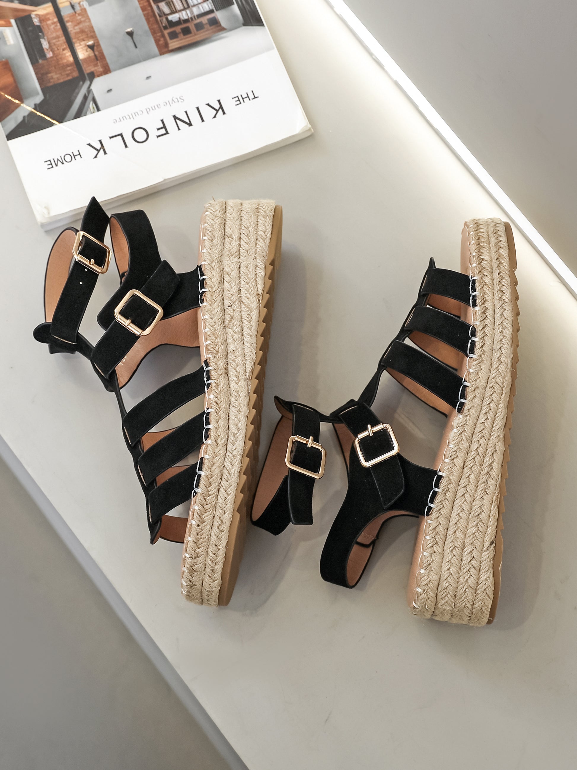 Une nouvelle interprétation des sandales de pêcheur. Un modèle à bout ouvert doté de plusieurs brides en suédine souple reposant sur une semelle à plateforme enveloppée de toile de jute.