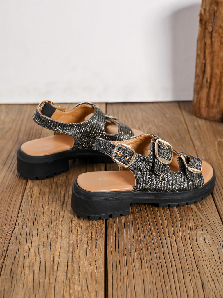 Diana est une sandale à semelle épaisse, elle est dotée de deux larges brides sur le dessus du pied, chacune ajustable avec une grande boucle métallique dorée.