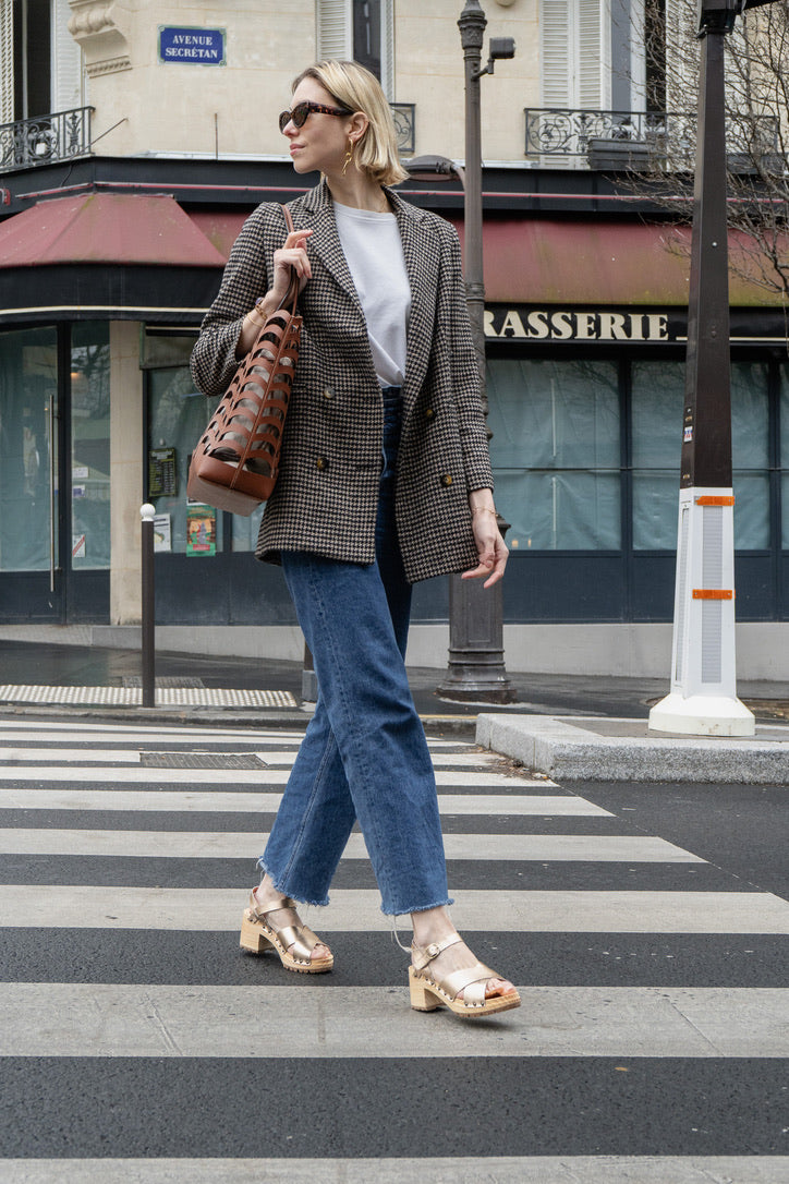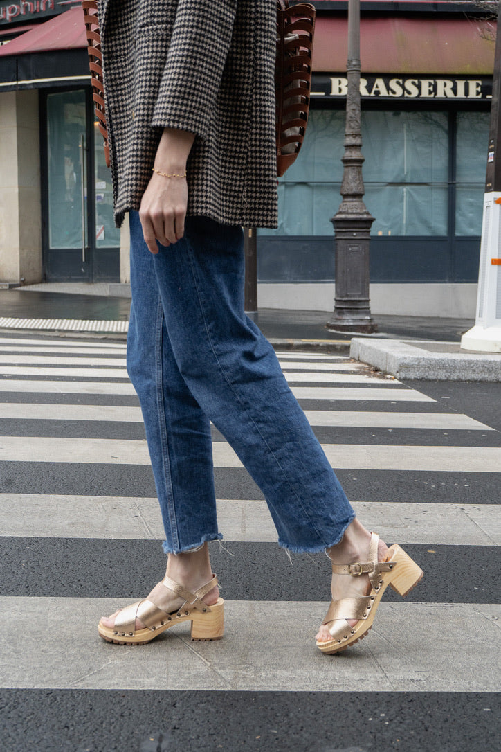 - Talon et semelle en bois naturel, rappelant le style des sabots traditionnels avec une finition moderne.